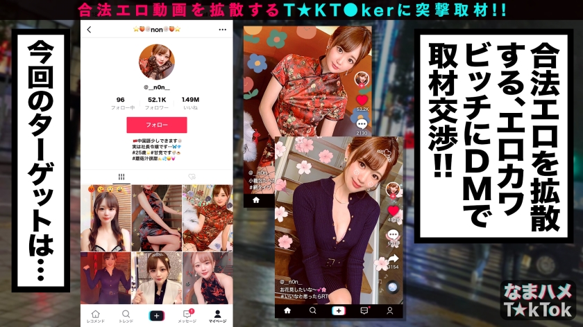 T☆kTokでエッチな動画を投稿するエロ可愛い女にDM(ダイレクトメッセージ)で連絡を取り、その場のノリでしれ~っとSEXまでしちゃおうという、次世代ナンパ企画!(1) 事前にスタッフが連絡を取り渋谷区道玄坂で待ち合わせた、今回のT☆kT●kerは「ノノ」ちゃん(25歳)!なんと彼女のお父さんは世界各地で何店もの中華料理店を経営している大企業の社長さん!とてつもない大金持ちの激かわ社長令嬢だ。(2)待ち合わせた場所の近くに彼女のお父さんが経営をしているお店があるということでそこでお酒を飲みながら色々とお話しを聞くことに!彼女は日頃からお父さんの付き添いで世界各地をまわり、T☆kT●kで少しエッチな動画をアップしているそうだ。そんなことをしているせいか各国のフォロワーからDMが届くこともしばしば、好みの男はそのままエッチまでしてしちゃうと意外と肉食系だ!お酒も手伝いドンドンエッチな話題に花が咲くと、彼女もエッチな気分になってきたのかボディタッチが増えあげく店内でキスまでしてしまう。すると彼女の方から「我慢できなくなったからホテル行きましょう」と可愛い顔でお誘いが!据え膳食わぬはということでそのままホテルへGO!(3)ホテルへ 到着した途端、濃密に唇をあわせ体をまさぐる、服を脱がして乳首をさわると「気持ちいい」声をあげながら可愛く感じるノノちゃん。下着越しにおマ○コを触ってみるとすでに濡れていてマン汁がたっぷりの様子。指マンするとピチャピチャ音をたてながら敏感にあえいでいました。そんなノノちゃんにチ○ポを差し出すと満面の笑みでお口に含み奥までジュポジュポ音をたて、男の顔を見ながらしゃぶるノノちゃん。「もう挿れたい♪」と我慢ができなくなった彼女は騎乗位の状態で自ら生チ○ポを挿入!自由自在に腰を振りまくり「すごいィィ、気持ちィィ」とイキまくる!!あまりの刺激におマ○コがバカになったのかピュッピュと何度もハメ潮を出しまくる!責め上手な彼女の腰つきにこちらも我慢ができず中出し2連発!! (4)彼女が普段から着ているチャイナドレスに着替え3回戦突入!まさかのノーブラ&ノーパン&網タイツとエロイにもほどがあるコスチュームに2回も出して萎えていたチ○ポも再び完全に勃起!網タイツ越しに生チ○ポを挿入すると、さっきより更に激しく突きまくる超ハードSEX!!カメラを見つめ感じるハメ顔さえも可愛い、まさに最高のオカズ美少女ノノちゃんでした♪