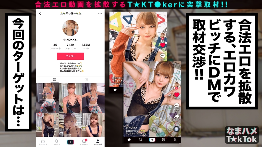 T☆kTokでエッチな動画を投稿するエロ可愛い女にDM(ダイレクトメッセージ)で連絡を取り、その場のノリでしれ~っとSEXまでしちゃおうという、次世代ナンパ企画!(1)今回は都内某所のスポーツジムで待ち合わせ!そこでジムインストラクターとして働く彼女が今回のT☆kT●ker見るからにエロそうな顔立ちとセクシーなジムウェア抜群に似合う「のっきー」ちゃん(24歳)!早速トレーニング中の彼女をモデルにT☆kT●k動画を撮っているとピチピチのジムウェア姿に興奮してしまった我々、それに気づいた彼女が「ちょっとシャワールームへ」と一緒に移動すると、こちらのズボンを脱がしまさかのフェラ抜き!このままホテルへ行こうとする彼女を一旦静止してカフェでインタビューをすることに(2)初体験の話や経験人数などエロトークに華を咲かしていると彼女から自身の性癖の事が、なんと彼女、男の汗が大好きで嗅いだり舐めたりしたいという異常な性癖を持っているらしい、そんなエロい会話に我慢ができず早速ホテルへと移動(4)ホテルへ着いた途端、彼女を脱がし、オッパイを揉みしだきながらおマ○コも刺激、イキやすい体質らしく、跳ねるようにビクついてイキまくる!男の汗が大好きな彼女は全身とべろんべろんと舐めまわすと、発情したのかオナニーまでする始末!ギンギン勃起したチ○ポを目の当たりにすると火照り顔で欲情する。何回イッても止まらないピストン攻撃にアヘ顔連発!中出しされてイキまくる!仕事で使うジムウェア着替えてくれたのっきーに有無も言わさず襲い掛かる!!エッチなパーソナルトレーニングに強烈アクメを繰り返すのっきー!チ○ポが持ってかれるほどの膣圧に本日4度目となくるザーメンをたっぷり中出し!そして盛大に吹きまくる潮!最後の最後まで敏感でドMな彼女の姿は本編でご覧ください。