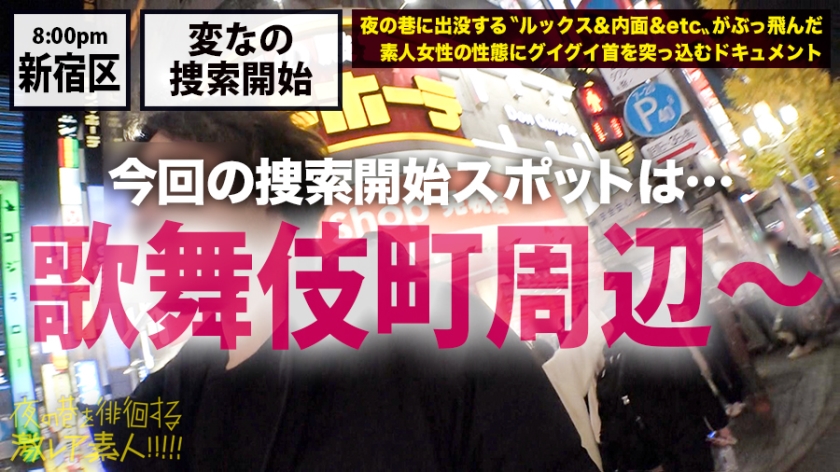 ○テーマ:夜の巷に出没するルックス&内面&etcがぶっ飛んだ素人女性の性態にグイグイ首を突っ込むドキュメンタリー○①クリスマスの時期に新宿をうろついていると道端で座り込んで飲み会をしていたりムササビの着ぐるみをしていたりヒッチハイクしていたりと無法地帯!こんなに色んな人がいるなら激レアさんもいるだろうと期待を込めて街中を歩きます。そこで出会ったのはホノカさん。ブランドのショップバックを何個も持って歩いているので声を掛けてみると今からお客さんから貰ったプレゼントを質屋に売りに行くというので着いて行きました。無事換金してご機嫌のホノカさんに密着で取材をお願いするとお客さんの家にプレゼントを貰いに何件か周るのでタクシー代払ってくれたら良いですよ♪との事だったので車を出して取材続行です。②次々と男からプレゼントを貰いそれを速攻で売りに行くホノカさんww一息ついたので呑みに行ってゆっくり話を伺います。経験人数が200人を超えると言う彼女、3人でホテル行きますか?とノリで言ってみると簡単にOKしてくれました。③ホテルで話をしながらおっぱいを触っても全然嫌がらないのでもっと大胆に触れて服を脱がすと気持ちよさそうに体を捻るホノカさん。スタッフのち○ぽを美味しそうに咥え、腰をゆらゆら揺らす姿がなんとも色っぽく魅力的です。④豊満なGカップでパイズリして貰えばあまりの気持ちよさについ出してしまい申し訳ないので男優にホテルまできて貰いセックス再開です。⑤目隠しをして刺激を与えたり電マを渡してオナニーをして貰いとろとろになってきたところで男優とバトンタッチしてさらに強い刺激を与えるとビシャビシャと潮を吹いてイってしまいました。後ろから挿入してピストンすれば脚をガクガク震わせて気持ちよさそうに喘ぎ、目をとろんとさせてセックスに夢中になってる様子のホノカさん。突き上げる度にぶるんぶるんと大きく揺れるおっぱいは絶景です。何度も膣奥目掛けてピストンし、カを堪能しながらフィニッシュ。激しいセックスが気に入ったらしくもう一回とお誘いをしてくるホノカさんでした♪