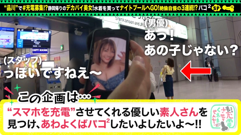 「充電させてくれませんか?」と優しい美女にお願いして、スマホを充電させてもらいつつエッチな充電もしちゃうスケベ企画。今回充電器を貸してくれた女神は、めいちゃん!静岡帰りでお土産を両手にたくさん持っていましたwお土産の中のパイを見せてもらったのですが、我々は別のパイに釘付けです。私服から露出が激しいですねw水着がほしいという話を聞き、充電のお礼に買ってあげることに!購入後はもちろんナイトプール!!あいにくの雨でしたが、人が少ない分めちゃ楽しく遊べました!そしてそのままホテルへ直行。楽しく雑談をしていると、大きすぎる胸にコンプレックスがあったと判明。国宝級のHカップにコンプレックスを感じる必要ないですよ!別の意味で感じてもらい、克服のお手伝いをしちゃいましょう♪脱がすと、ぷっくり乳首もキレイな美巨乳でした!超柔らかい!!お尻も肉厚!上下どちらも揉み甲斐がありますねぇ~!手マンでほぐすともうびちゃびちゃwマン汁溢れるわ潮吹くわで一面水浸しですwwwもう準備完了ぽいので挿入れちゃいます♪床やソファでエンドレスピストン!壊れるくらいの喘ぎ声がチ●コにキますね!!もちろん中出し→シャワーの鉄板ルート!シャワー中もパイズリしてもらい、おっぱいにセカンド射精!下着に着替えて正式な2回戦を開始します。薄ピンクの清純ランジェリー!!その姿にふさわしく、正常位でいちゃいちゃ拘束&高速ピストン!そしてお口に大量射精!絶倫対決は引き分けで終了にしときますかw