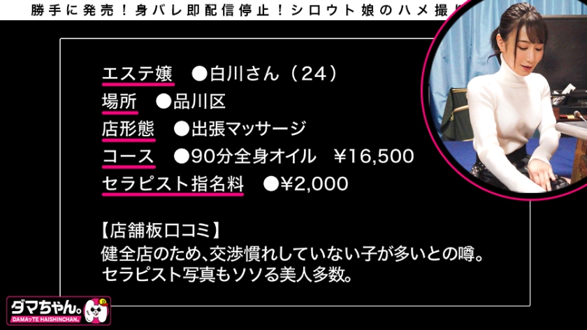 【身バレ即配信停止】―――――《この作品はエステが好き過ぎてエステ嬢と結婚するも、エステ狂いが原因で離婚した盗撮好き汁男優のエステ盗撮ドキュメントである。》―――――※本作品は4K高画質で録画されております。そのため一般的な盗撮作品よりも高画質での収録となっておりますが、お客さまの再生環境により、画質は異なります。ご了承下さいませ。―――――【今回のメンエス嬢】・白川さん 24歳 →ハメ撮り&中出しOK!顔も○ ・本番交渉難易度:ノリ良し○・感度:バッチリ○ →ハメ潮スプラッシュ!【料金】品川区発・某出張マッサージ店(健全店)・90分全身オイルマッサージ →¥16.500 ・セラピスト指名料 →¥2.000―――――#白川さん #24歳 #出張マッサージ嬢#中出し! #イキまくり #ド敏感 #スプラッシュ潮吹き #逆マッサージ #電マ責め絶頂 #盗撮 #ハメ撮り #6カメ #90分オイルマッサージコース#品川区発某店 #健全店 #本番―――――素人ハメ撮りクルー『だまちゃん。』による超グレーな完全個人撮影モノ!!!※無許可素人作品につき取り下げ可能性がある作品になります。