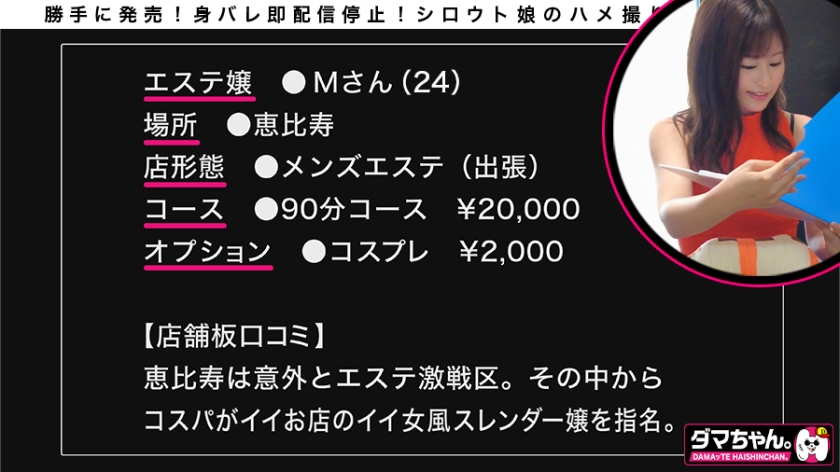 この作品はエステが好き過ぎてエステ嬢と結婚するも、エステ狂いが原因で離婚した盗撮好き汁男優のエステ盗撮ドキュメントである。―――――【今回のメンエス嬢】・Mさん 24歳 巨乳!美人!スタイル良し○ ・本番交渉難易度:○ ・感度:ビンカン○ 絶頂!スプラッシュハメ潮!【料金】恵比寿某出張メンズエステ店 ・90分コース ¥20.000 ・オプション(コスプレ) ¥2.000【感想】やわらかい関西弁のスレンダー巨乳美人嬢○めちゃくちゃイキやすい子でビックンビクン痙攣絶頂しまくり!スプラッシュ潮吹き、綺麗に撮れました!!「腰止まんない!」「もっと腰振ってイイ?」とアクティブがっつき系セックスで1000点!最高でした!!!―――――※本作品は4K高画質で録画されております。 そのため一般的な盗撮作品よりも高画質での 収録となっておりますが、お客さまの 再生環境により、画質は異なります。 ご了承下さいませ。※レビュー欄で人名及び地名や施設名など、 出演者の特定に繋がる書き込みはご遠慮下さい。