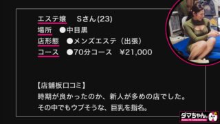 Sさん|配信専用 素人 エステ・マッサージ ドキュメンタリー ローション・オイル スレンダー 美脚 清楚 巨乳|―――――――――――――――【今回のメンエス嬢】・Sさん(23歳)ちょろいっす!明るくて笑顔が可愛い純朴ナイスバディ巨乳娘!!・マッサージテク:B【料金】70分コース・指名料込み¥21.000【感想】明るくてノリが超いいニコニコ笑顔がかわいい純朴系巨乳娘!やせ過ぎずのTHE健康的ボディとナチュラルマン毛がめちゃ高ポイント!セクハラ笑発言にも笑顔で対応してくれるしイケる気しかしませんでした!!!勃起チ○ポを見せつけてたら見せてくれたはにかみ笑顔が超かわいい!おわん型美巨乳を思うがままにいじらせてもらうと「ぅん...恥ずかしい...」と言いながらも感じてる様子!手マンしてみるとアッツアツになって濡れてるマ○コ!「ひゃっ...やぁっ!だめっだめぇ...」はい!素晴らしい!!!超かわいい!アツアツま○こに挿入すると「だめっ!イッちゃう!だめぇイクイク!!」「イクイク!!あぁっ!!!もうだめだって!イックゥ!!」すぐイク!感度良し!!ギャップがエロいお姉さんでした!―――――――――――――――MGS動画
