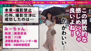 みーちゃん 22歳 美容部員|配信専用 素人 独占配信 企画 清楚 美尻 オモチャ コスプレ 顔射 放尿・失禁|【巷で話題のレンタル彼女=恋人代行サービス。で働くアイドル級美少女<素人娘>に、ハメ撮り交渉!】※本来、性的サービスは禁止です。本日のお相手は、綺麗な髪で真っ白な肌の清楚女子「みづき」さんです!趣味で動画を撮ってるから撮影許可をお願いすると、「お店の人にバレなければいいよ♪」と優しく承諾♪というわけで撮影しながら浅草デートスタート♪浅草の下町風景を見ならがお手々つないでまったりとお散歩♪雷門の前で突然、「ここが私のア●ザースカイ♪」とポージングをしだした時は彼女の可愛さとボキャブラリーの豊富さに惚れてしまいました♪途中で買ったソフトクリームの食レポは、下手っぴ過ぎて愛らしい♪ほっぺについたクリームをペロっとする姿も超カワイイ♪次に向かったのは手ぶらで行けるグランピングキャンプ場♪バーベキューをして個室テントでまったり♪二人の雰囲気は既にビジネスの関係ではない♪自然な流れでイチャイチャタイムが始まった♪ほっぺにキス、身体を寄せ合って唇にキス♪彼女の身体をやんわりと触って「ホテルに行こ」と誘ってみた♪「お店にバレないならいいよ♪」と笑顔の彼女♪こうして完全プライベートの延長タイムに突入した♪MGS動画
