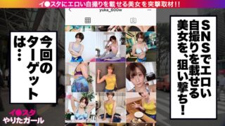 ユカ・600W 21歳 ヨガと筋トレが大好きな料理学校アシスタント|中出し 顔射 潮吹き オナニー 美尻 美乳 企画 素人 配信専用 独占配信|イ●スタグラムでエロい画像をUPするビッチな女子にコンタクトを取り、どうにかこうにかSEXしちゃおうという、新時代SNSナンパ企画!①今回、恵比寿にて待ち合わせたのはショートカットの美少女、ゆかちゃん。お仕事は料理教室講師のアシスタント。元々SNSには料理の写真を載せていたそうですが、料理よりもよりもスポーツウェアの写真のほうがフォロワーが増えるということに気づいて、セクシーなウェア写真をアップするようになったそうです。②現在お付き合いしている人はいないそうですが、イ●スタで知り合った人とセックスしちゃったり…と性生活のほうは充実している模様。そんなゆかちゃんの経験人数は仰天の300人越え!!!そのうちのほとんどがSNSで出会った人なんだそうです。性欲が強いと話すゆかちゃんはセックスだけでは飽き足らず、週4でオナニーをするという生粋のオナニスト。1日に何度も連続でオナニーするため、過去には電マが爆発したこともあるんだそうです。③車に乗り込み、ホテルへの道中は電マでオナニー。慣れた手つきで乳首や秘部に当ててぴくぴく身体を震わせ、絶頂してしまいます。ホテルに到着して男優と対面すると、恥ずかしがりながらもキスを交わし、セックスが始まります。華奢な体で男優の巨根を受け止め、悶絶するゆかちゃん。か細く可愛い喘ぎ声をあげてよがり、何度も何度も絶頂を繰り返し、最後は膣内に濃厚なザーメンを発射!その後もウェアやコスプレ衣装に着替えて濃厚なセックスが続くのでした!!!MGS動画